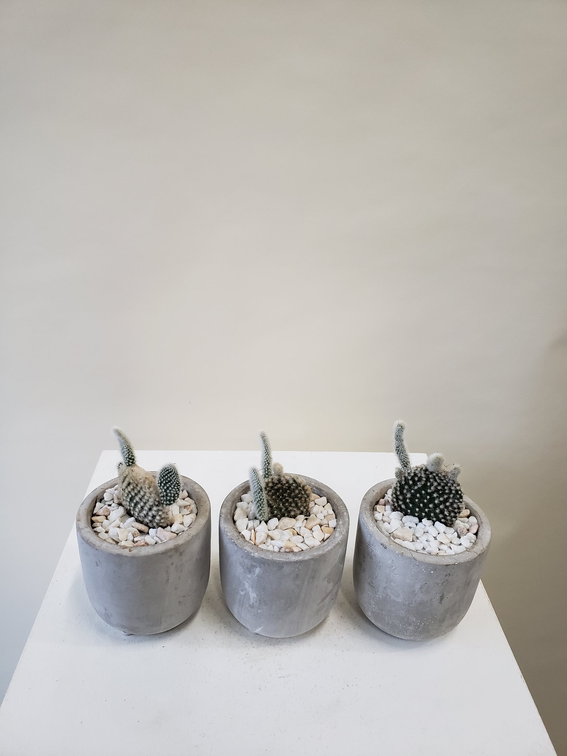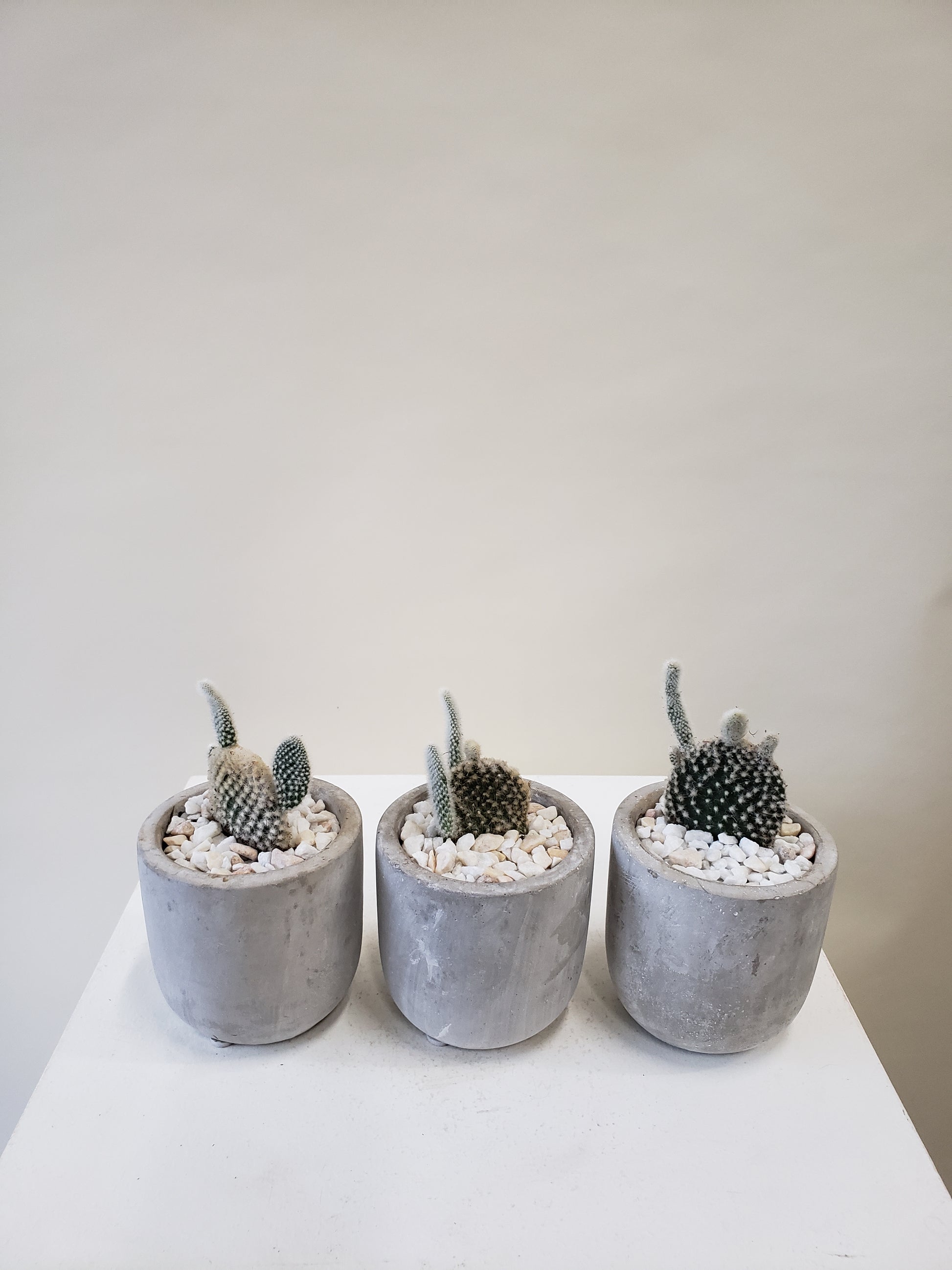 Three (3) quaint and quirky assorted 3" Bunny Ear Cacti in a small Concrete container. Low maintenance, easy to care for. Set of 3.