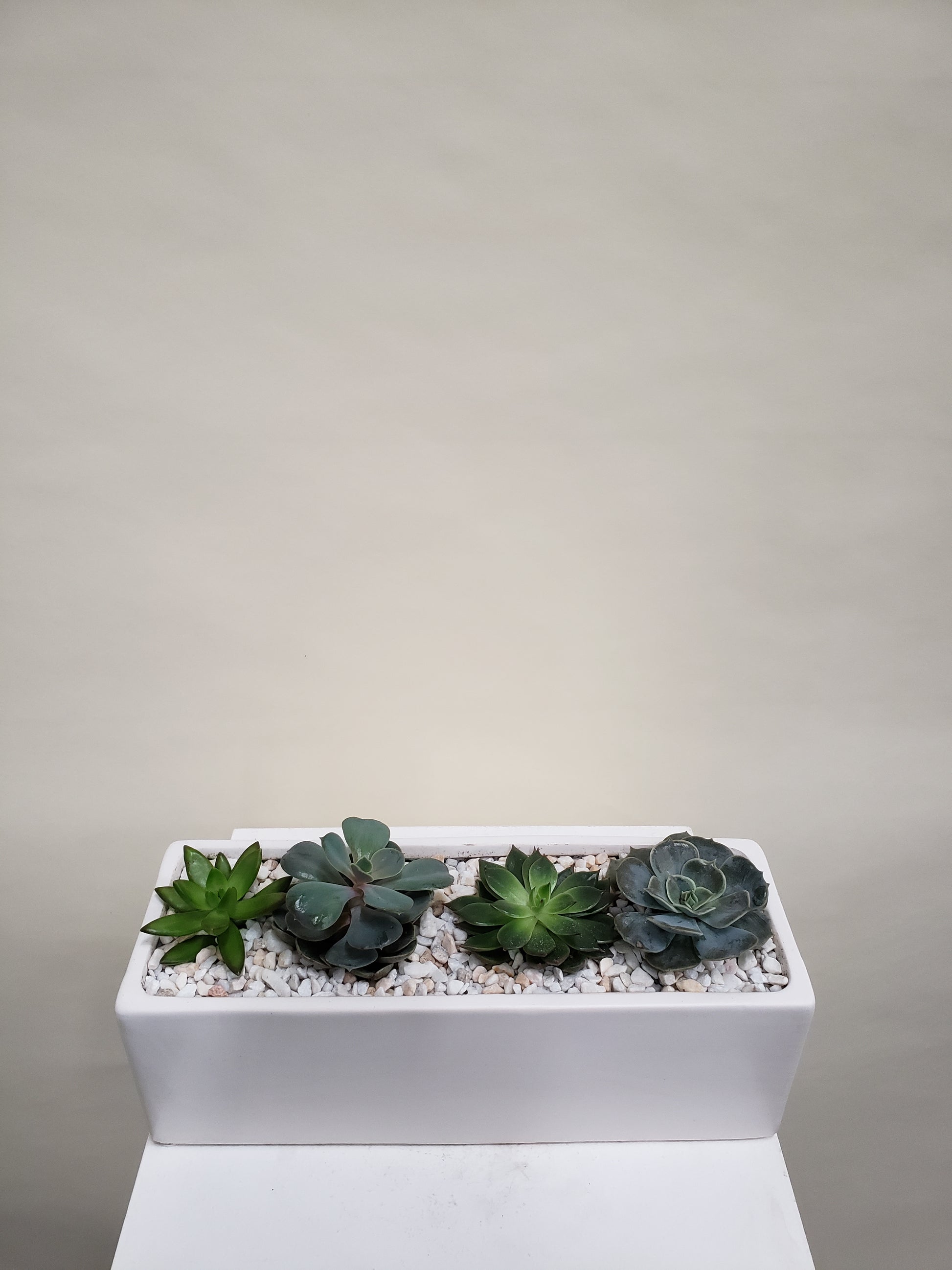 Four (4) Quaint and quirky assorted 2" succulents in a long white rectangular planter or long rectangular cement planter.
